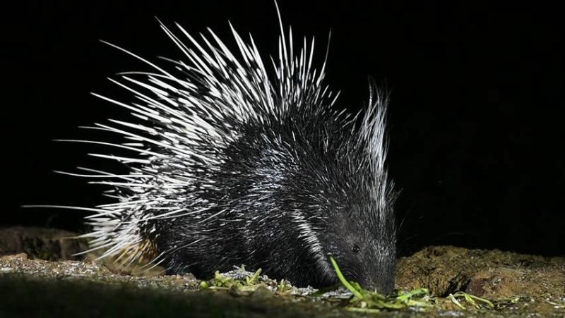 生活习性:豪猪全身棕褐色,背部、臀部和尾部都生有粗而直的黑棕色和白色相间纺捶形棘刺,当遇到敌人和发怒时,会迅速将身上约1米长的棘刺直竖起来,硬刺不停地抖动,发出“唰唰”的响声;同时嘴里也发出“噗!噗!”的叫声。豪猪为夜行性动物,白天躲在洞内睡觉,晚间出来觅食。行动缓慢,反应较差。在冬季有群居的习性,活动路线较固定。长在深山老林,多成群结队,喜食花生、番薯等农作物,特别喜欢吃盐。秋冬季交配,春季或初夏产仔。豪猪怀孕期110天左右,哺乳期50天左右,通常一年两胎,一胎二仔。