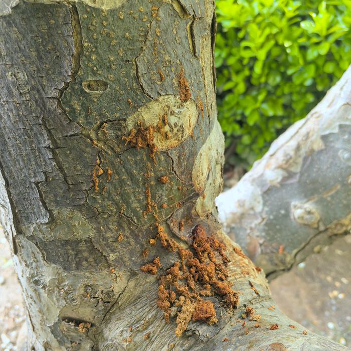 3、天牛。现阶段主要以幼虫在树干或枝条内蛀食危害,并从蛀孔处向外排出虫粪木屑,阻碍养分和水分的输送,导致树木生长衰弱。严重时,造成枝干干枯或风折。寄主植物:悬铃木、桃、柳、樱花、海棠、白蜡、紫叶李等。