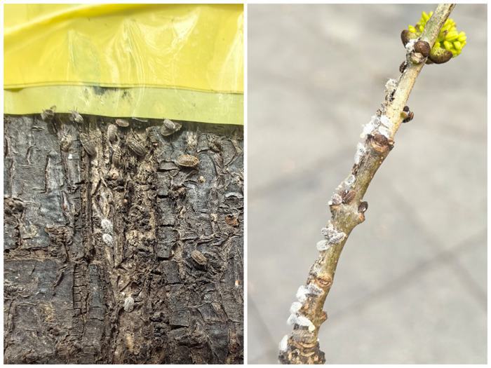 1、草履蚧。现主要以若虫聚集在寄主植物枝干、芽基等部位吸汁危害,排泄蜜露,并陆续蜕皮,严重影响树势和景观效果。寄主植物:悬铃木、白蜡、槐、紫叶李、海棠、樱花、月季等。