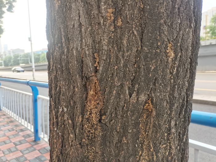 5.小线角木蠹蛾。现阶段主要以幼虫在树木枝干内蛀食危害,蛀孔外可见球形粪屑排出,影响植物养分和水分输导,轻者造成枝条干枯、风折,重者树皮环剥、整株死亡。寄主植物:槐、银杏、海棠、白蜡、榆叶梅、柳、榆、栾、山楂等。