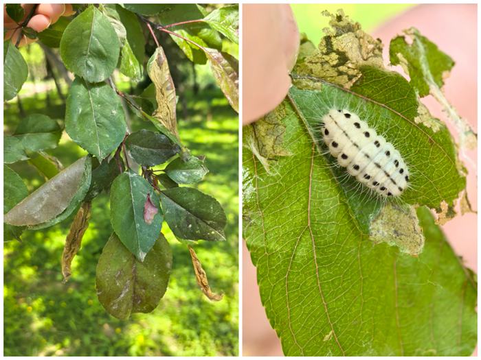 4.梨星毛虫。主要以幼虫啮食叶肉成筛网状,幼虫稍大后吐丝连缀叶缘,将叶片向正面纵折包成饺子形虫苞,在其内取食叶肉,仅残留下表皮呈透明状,被害叶枯焦,严重时全树叶片干枯。寄主植物:海棠、樱花、山楂等。