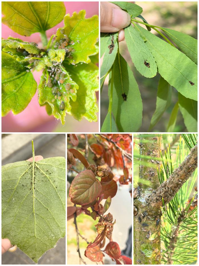 1.蚜虫。现阶段多种蚜虫进入危害盛期,以成蚜或若蚜群集寄主植物顶芽、嫩梢、花蕾等处刺吸危害,造成受害部位发黄、卷曲、皱缩等,其分泌的蜜露污染枝叶及树下路面,易诱发煤污病。寄主植物:油松、白皮松、雪松、金银木、紫叶李、毛白杨、碧桃、月季、木槿、杏、榆、柳等。