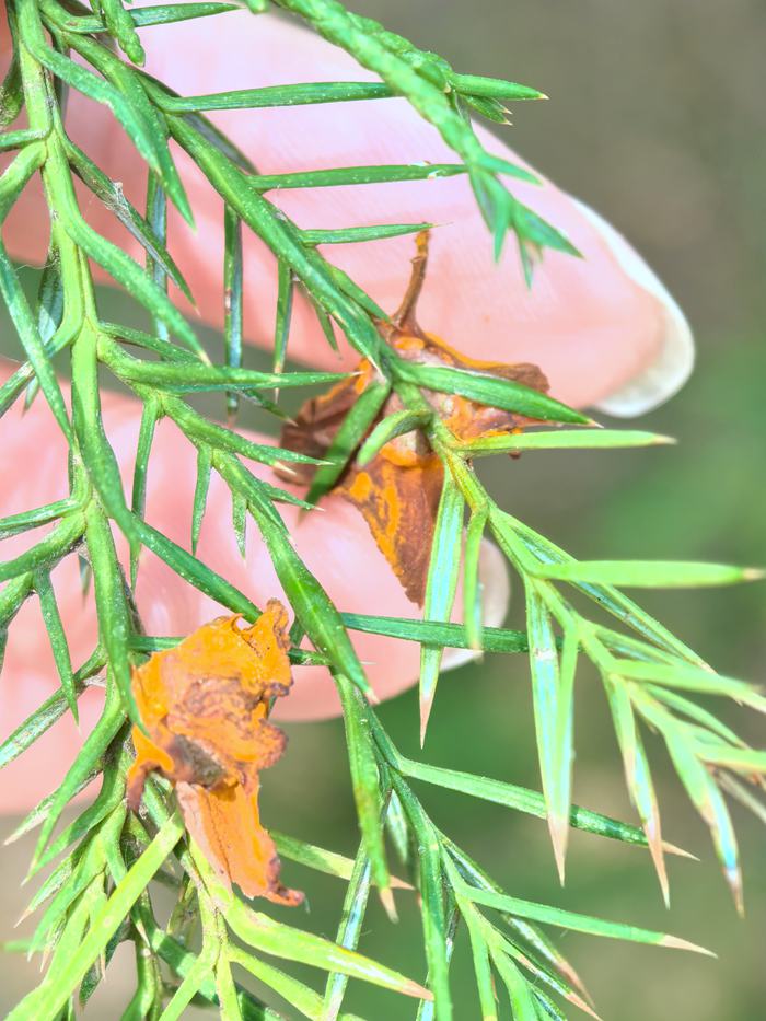 6.苹果-桧柏锈病。该病是一种转主寄生的真菌病害,主要为害苹果、海棠的叶片,为害后病菌转移到桧柏越冬,于翌年3月下旬冬孢子逐渐成熟,冬孢子角遇雨即胶化,冬孢子萌发黄粉状的担孢子,担孢子主要借风传播到海棠类植物上。桧柏受害严重时,小枝枯死。寄主植物:海棠、苹果、梨、木瓜、山楂、桧柏等。