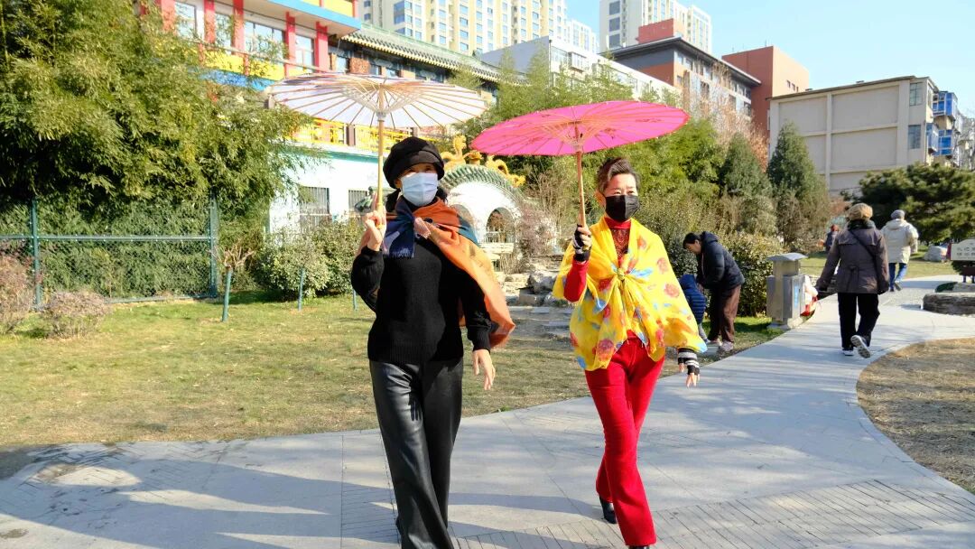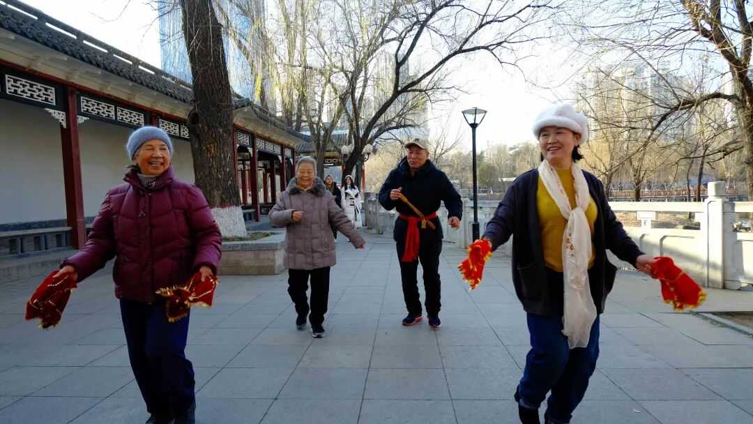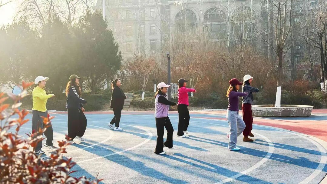 平安公园内,太极爱好者舒展肢体,刚柔并济的招式让寒风也变得柔和;悠扬的舞曲回荡,两位时尚的女士舞姿优雅,传递着灵动的韵律。