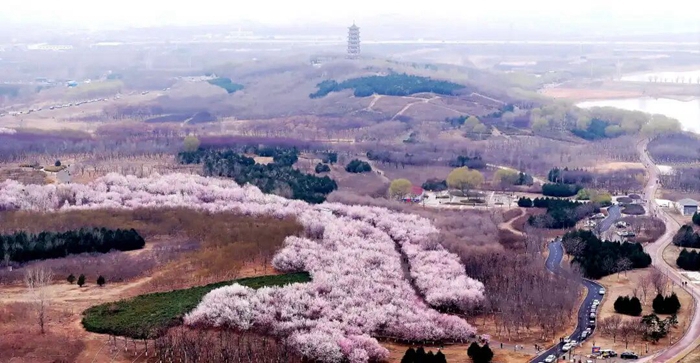 仲春时分,滹沱河畔映秀山上的近5000株山桃竞相开放,漫山粉嫩,娇艳欲滴,引得众多游客前来赏花。