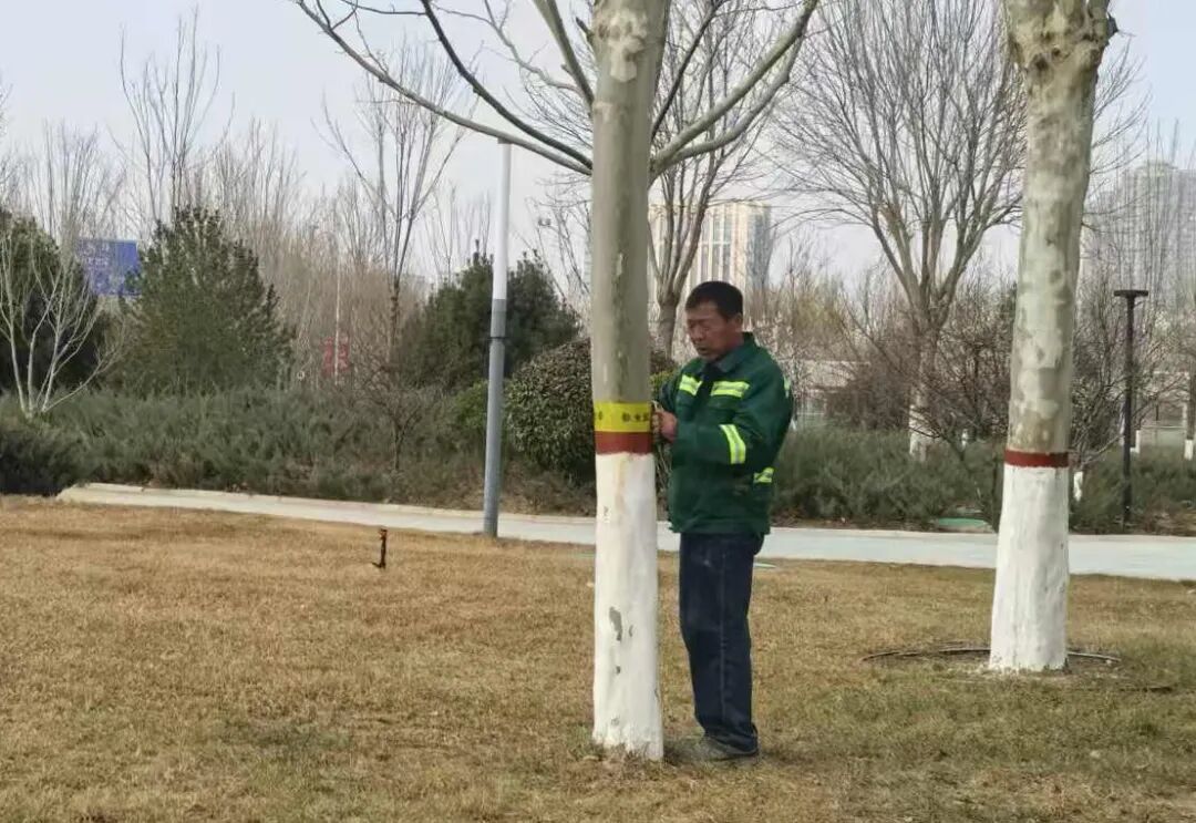 随着气温回升,园林病虫害进入高发期。为提升防治效果,该园在树木涂白部位上方粘贴两圈防虫胶带,以物理阻隔方式防止草履蚧等害虫上树;对全园绿植喷施石硫合剂,灭杀越冬病菌及虫卵,从源头降低病虫害发生概率。
