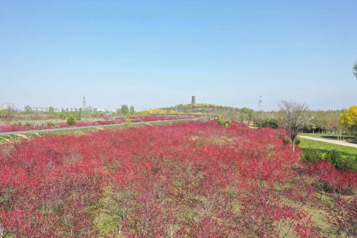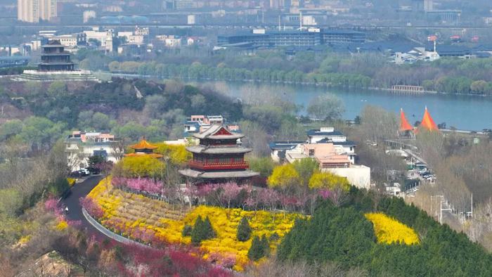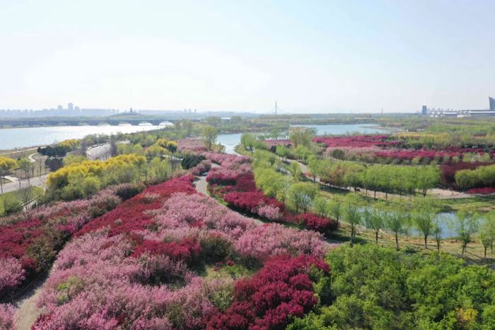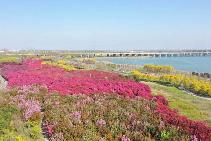 鹅黄的连翘缀满坡地,粉白的海棠娇艳欲滴,绽红的碧桃如云似霞,紫红的紫荆满树繁花,嫩绿的柳丝轻拂堤岸,层层叠叠的颜色如画笔勾勒出春日的靓丽。
