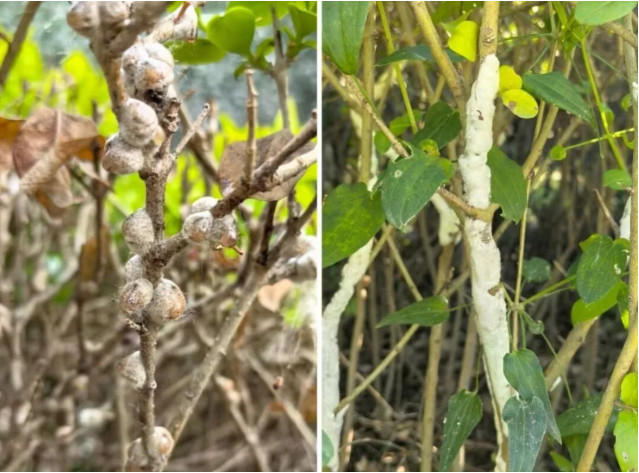 园林植物上的介壳虫种类较多,多数种类虫体上被有蜡质分泌物,有特殊的介壳保护。这类害虫产卵量大,以成虫、若虫集聚在植物的树干、枝条、叶片、嫩芽及花蕾上刺吸为害,造成植株叶色发黄、落叶或枝梢枯萎,发生严重时,布满整个枝条,易导致煤污病,使枝叶发黑,并常有蚂蚁共生。