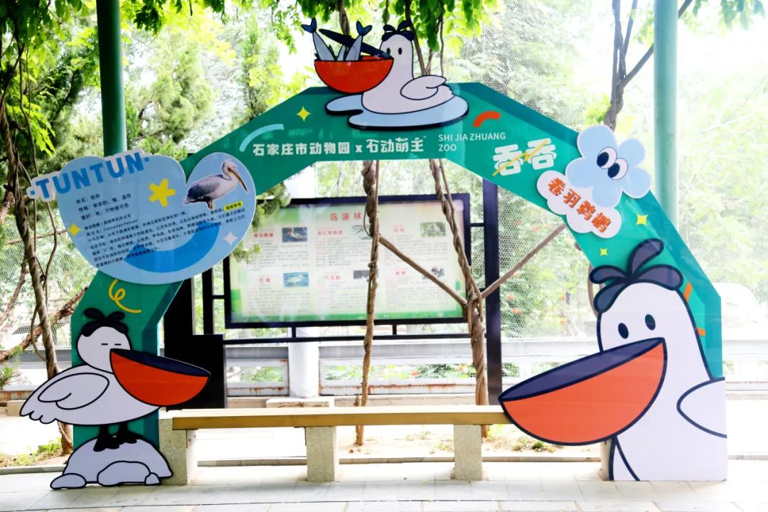 绿色拱门萌到犯规!上面的卷羽鹈鹕 “吞吞” 挂着标志性的橙色大嘴,仿佛在说 “快来和我贴贴”!小朋友看到直接走不动道,拍照同框,这画面也太治愈了叭~