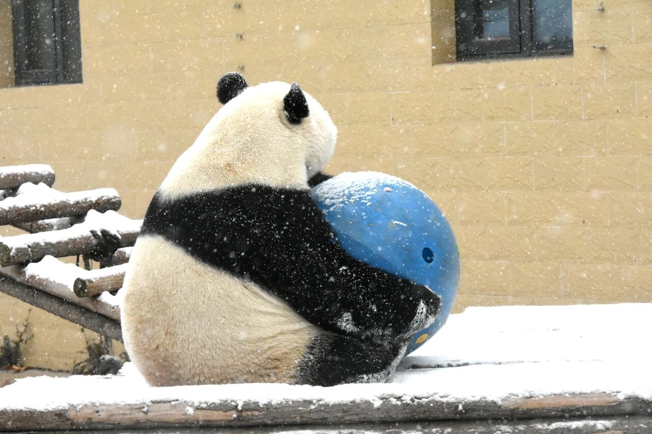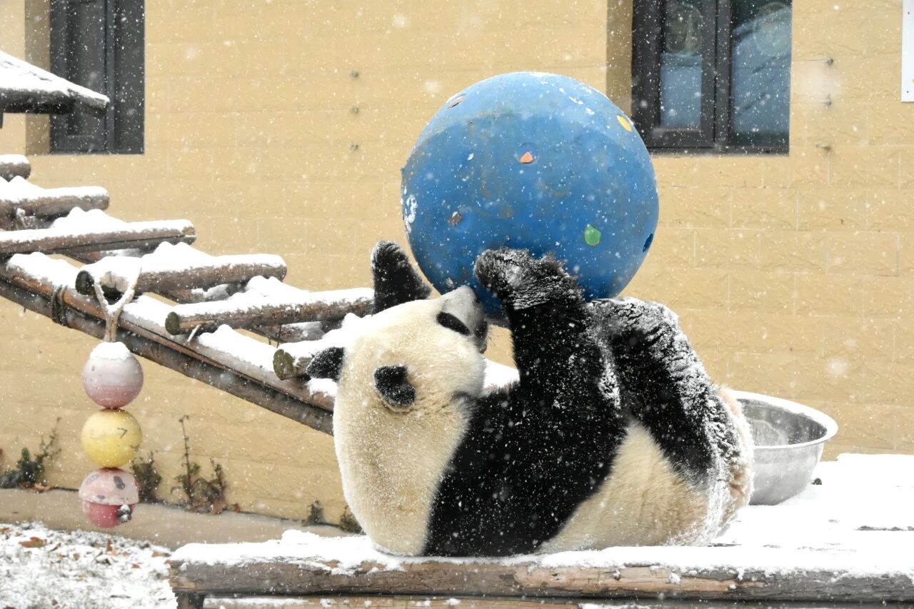 你看它,黑白相间的绒毛上沾着星星点点的雪沫,活脱脱一只会动的“雪顶团子”。一会儿抱着竹笋坐在“专属宝座”上大快朵颐,笋壳碎屑混着雪花粘了满脸,认真干饭的样子萌到犯规;一会儿又盯上了蓝色的漏食球,仰躺在栖架上,四脚朝天地举起球,玩得那叫一个不亦乐乎。
