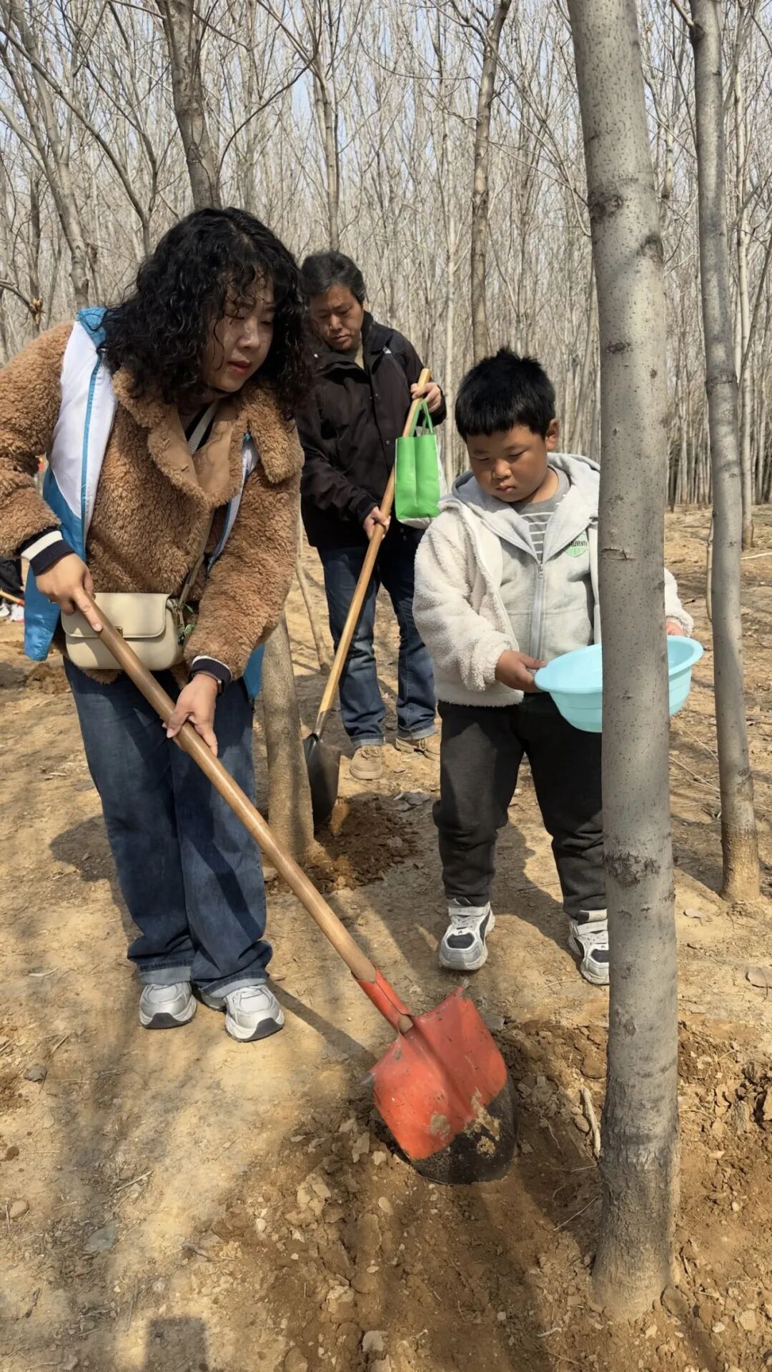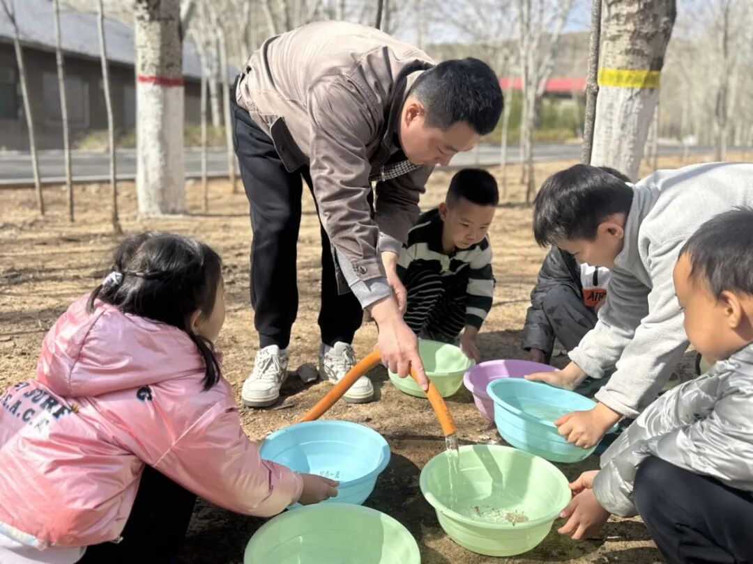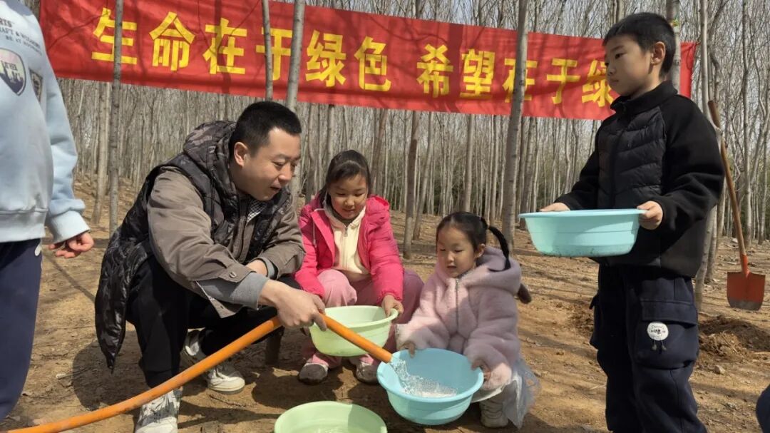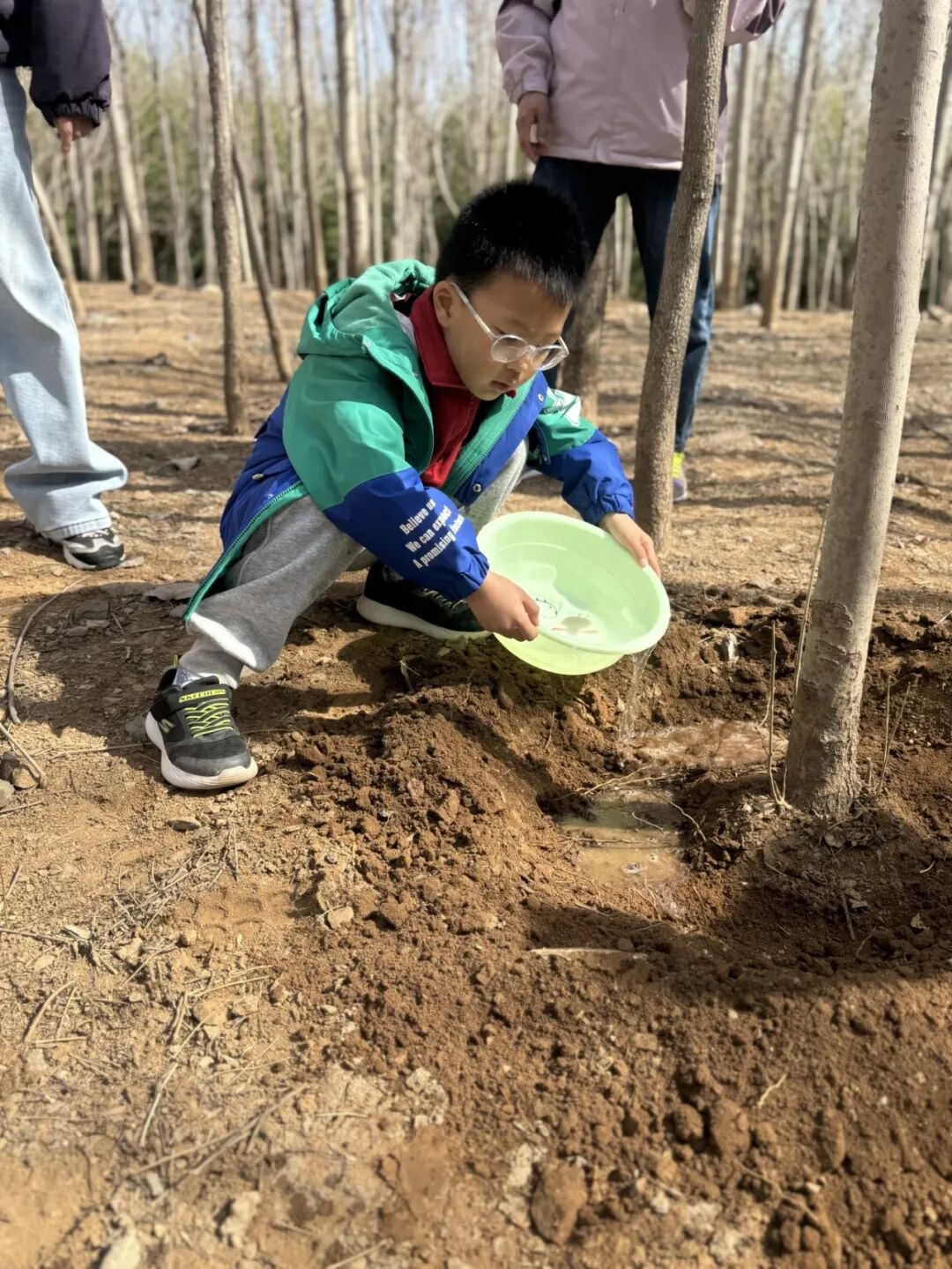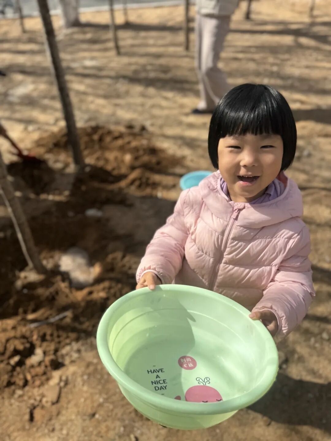 随后,孩子们化身小小护绿员,和爸爸妈妈分工协作:有的挥锹挖坑筑围堰,有的提桶浇水,认真又专注。大家亲手为树木围好储水坑,再将清水缓缓注入,看着水分慢慢渗入泥土,用实际行动为春日添绿。孩子们还把亲手制作的心愿卡挂在枝头,写下对小树、对春天的美好祝愿,让园区里处处充满温暖与生机。