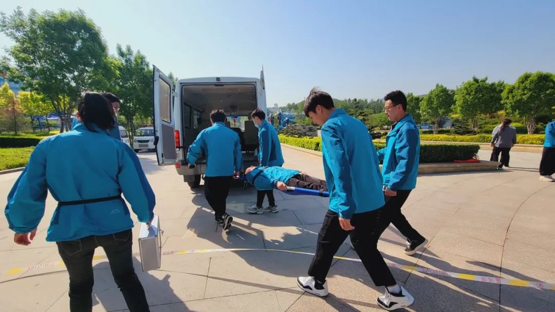 争分夺秒守护生命防线。模拟一名游客在园区水域不慎落水的场景。发现险情后,园区巡逻人员第一时间通过对讲机发出求救信号,园区应急指挥中心立即启动救援预案。水上救援组迅速抵达落水点,利用救生圈、救生杆等救援设备,成功将“落水游客”救起,并转移至岸边安全区域。医疗救护组随即对“受伤游客”进行检查和初步救治并同步展开心肺复苏、外伤处理等急救措施,整个救援过程紧张有序,配合默契,展现了高效的生命救援能力。