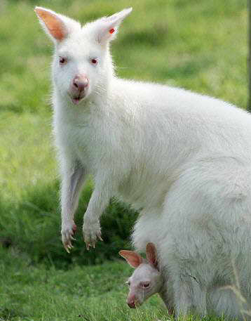 生活习性:白袋鼠是赤颈袋鼠的白化种类,它们的生活习性和赤颈袋鼠一样,生活在森林地带,跳跃和行走,以草为食,白袋鼠是赤颈袋鼠群体中基因突变的个别现象,与其它袋鼠相比,它们显得特别娇气,容易得病,成活率低,因此十分珍贵。孕期约1个月,寿命达10年。