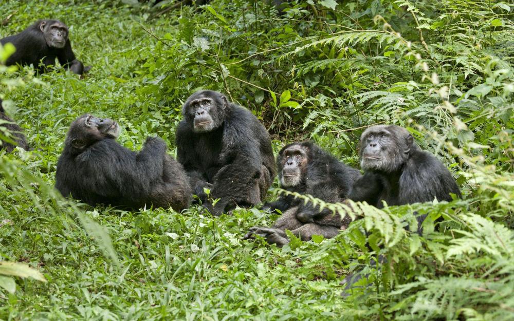 生活习性:栖息于热带雨林,集群生活,每群2-20余只,由1只成年雄性率领。食量很大,每天要用5-6个小时觅食,吃水果、树叶等,也会集体围捕狒狒、羚羊、野猪等较大动物。有一定的活动范围,觅食区域往往是它们集中的地点。群与群间有往来。长久保持母子关系,分群后还常回群探母。有午休习性。孕期8-9个月,每胎1仔;哺乳期约1-2年,性成熟约12年,寿命约40年。能辨别不同颜色和发出32种不同意义的叫声。能使用简单工具,是已知仅次于人类的最聪慧的动物。