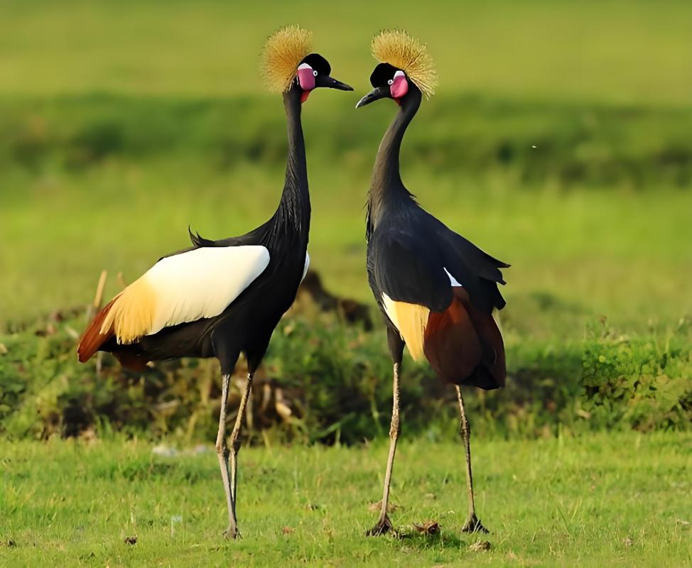 生活习性:黑冠鹤是为尼日利亚的国鸟。喙粗直,呈灰黑色,鼻孔位于中部,额部向外凸出,具乌黑色的绒羽。面颊上白下红,与乌黑色的额羽形成了鲜明的对比色彩。枕部具无数条土黄色绒丝向四周放射,形成一个美丽的绒球,称之为冠羽。除次级飞羽为灰白色外,其余羽毛为黑色。雌雄鹤羽色基本相同。黑冠鹤一种没有迁徙行为的留鸟。性喜集群,栖息在开阔的沼泽地区。以昆虫、无脊椎动物、鱼类、两栖动物、小型爬行动物以及谷物和草籽为食。每窝产2-5枚卵,孵化期27–30天,3-5岁性成熟,寿命25-35年。