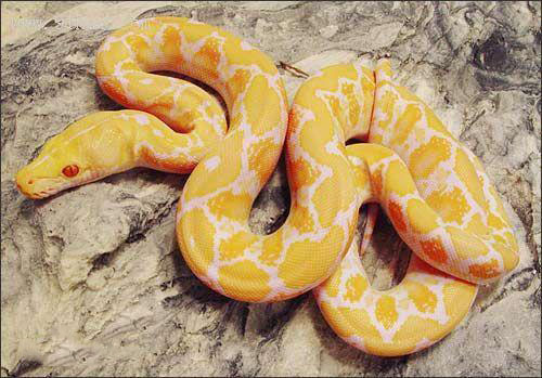 生活习性:喜欢高温环境,居住地是季风森林,干燥森林和稀树大草原。黄金蟒是缅甸蟒蛇的白化突变种,成体可以长到约7米长,其通体金黄并有白色不规则纹路,鳞片滑顺,头顶具有大鳞片以及热感颊窝。性温和,也会开口咬人,发脾气时,会发出“嘶嘶”的声音。以鸟类和哺乳动物为食。