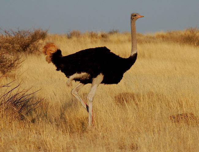 生活习性:非洲鸵鸟是世界上最大的一种鸟类,成鸟身高可达2.5米,雄鸵鸟体重可达150千克。善于奔跑,不能飞行,是世界上现存鸟类中唯一的二趾鸟类。有发达的气囊和良好的循环系统来调节体温,具有异常的耐热性,即使气温高达56℃仍然能在酷暑的日光下寻觅食物,也可以几个月不饮水。叫声响亮而重浊,如同狮吼一般。性情机警而多疑,听觉、视觉都很灵敏。主要栖息于荒漠、草原和灌丛等地带,喜爱结群,通常为10-15只,以植物的茎、叶、果实等为主,特别是开花的灌木。婚配为一雄多雌,一般1只雄鸟配3-5只雌鸟。筑巢于地面,所有的雌鸟将卵生在同一个巢穴中。每只雌鸟产卵10-12枚,每窝的卵数可以达到25-30枚。白天雌鸟孵化,夜晚雄鸟承担。孵化期为40-42天。非洲鸵鸟的卵是现存鸟类中最大、最重的卵,卵重可达体重的1%左右。
