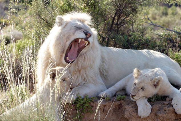 生活习性:又叫“白化非洲狮”,是非洲狮的基因变异后代,生存习性与非洲狮无异,常成群活动在草原或开阔的丛林里,合群包围捕食猎物,但它们的毛色在野外环境中较为显眼,隐蔽性差,致使捕食成功率低,生存较为艰难。因此,当地人一旦发现白狮,就把它们带到动物园保护起来。