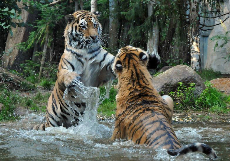 生活习性:栖居于森林、灌木和野草丛生的地带。独居,无定居,具领域行为,活动范围可达100平方公里以上。夜行性,感官敏锐,性凶猛,行动迅捷,善游泳,善爬树,很少袭击人类,虎的叫声特别响亮,能达2千米远。东北虎主要捕食鹿、羊、野猪等大中型哺乳动物,也食小型哺乳动物和鸟。捕食方式为偷袭。冬季交配,孕期为103至105天,一胎生2至4仔,二至三年生产一次,野生寿命15至17年,最高为20年,人工饲养情况下寿命为20-25年。